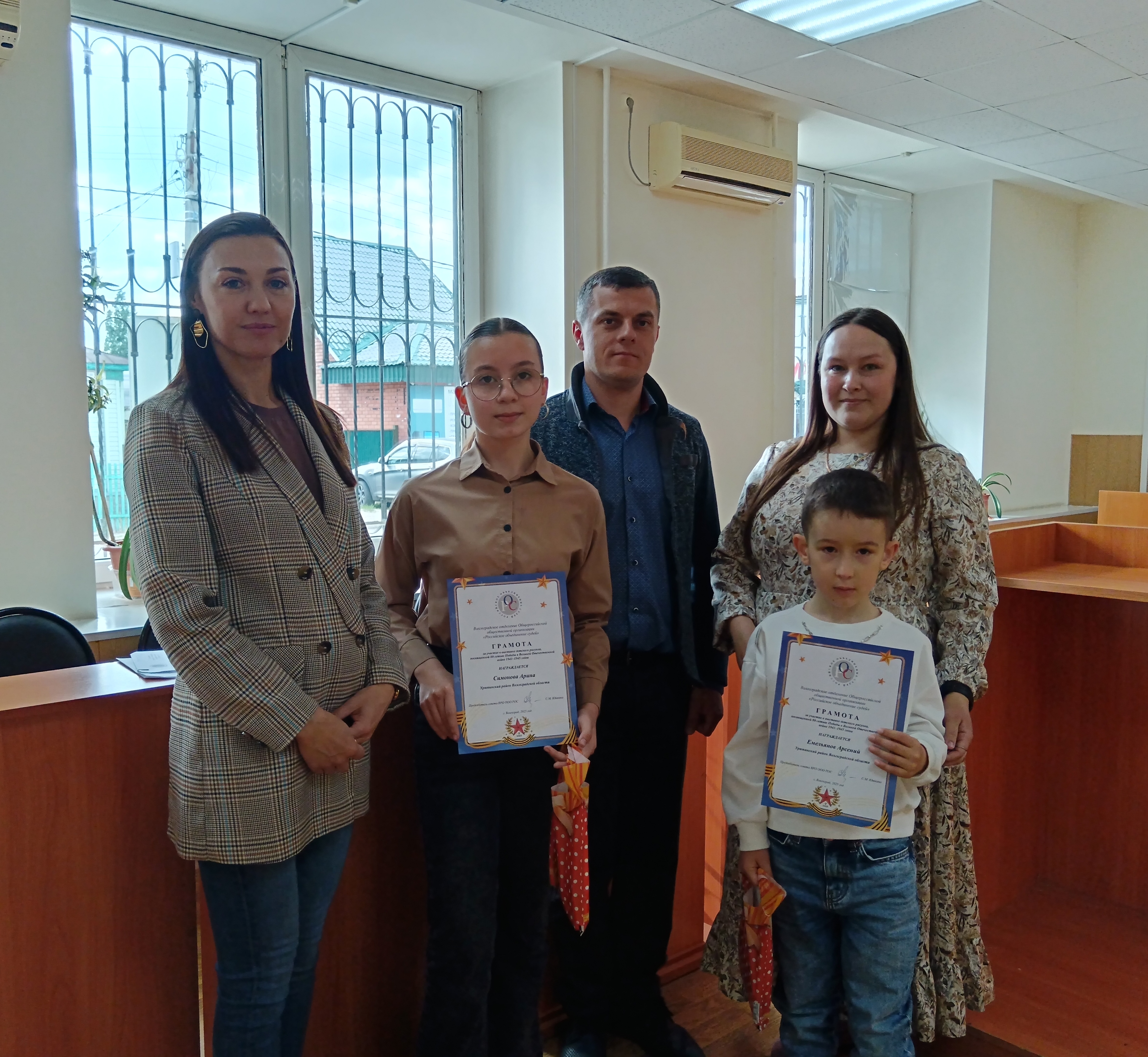 ![]() Волгоградским областным судом совместно с Советом Волгоградского регионального отделения Общероссийской общественной организацией «Российское объединение судей» для приобщения детей к истории родной страны, воспитание у детей и подростков чувства патриотизма, уважения к защитникам Отечества, проводилась выставка детских рисунков «Наши Герои», посвященной 80-летию Победы в Великой Отечественной войне 1941-1945 гг. От Урюпинского городского суда Волгоградской области в выставке принимали участие творческие работы Симоновой Арины и Емельянова Арсения. 15 мая 2025 года председатель Урюпинского городского суда Волгоградской области Савченко И.Н. вручила грамоты авторам рисунков.